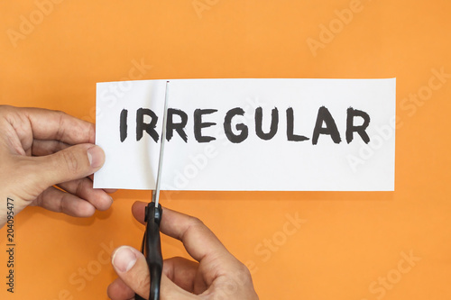 Closeup man cutting paper of irregular word. concept for self belief, positive attitude and motivation. irregular is regular concept.
