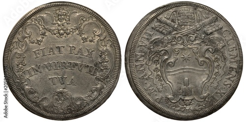 Vatican City coin 1 one piaster 1708/1709, motto in Latin Let peace be inside you within circular vignette, pope Clement XI, papal arms, St. Peter’s keys above, tiara, silver,