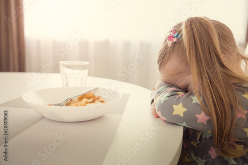 Girl refuses to eat. Child meal difficultes theme.