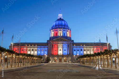 San Francisco City Hall illuminated in Memorial Day Colors. The red, white and blue colors resemble those of the American Flag. Civic Center Plaza, San Francisco, California, USA.