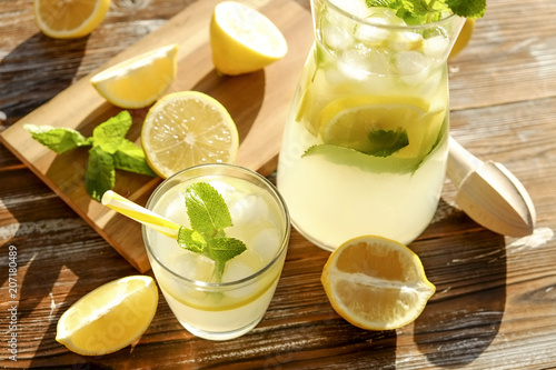 Iced lemonade pitcher, wooden juicer & one glass of cold citrus beverage with lemon slices, mint leaves & yellow straw on brown grunged wood textured table sunny day, background. Close up, copy space.