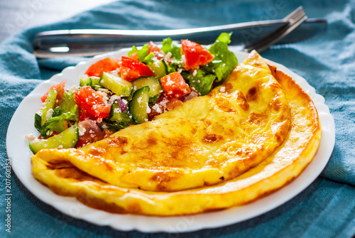 Omelet with vegetable salad in white plate on table
