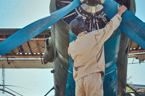Pilot or mechanic in a full flight gear checks the propeller of his retro military aircraft before a flight.