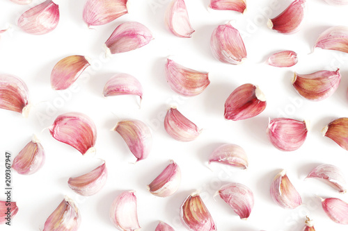Pattern of fresh garlic lobules, top view. Food background, texture.