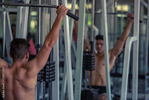 Portrait of young man using weight lifting equipment to build a massive chest and arm at indoor sport gym , bodybuilder concept.