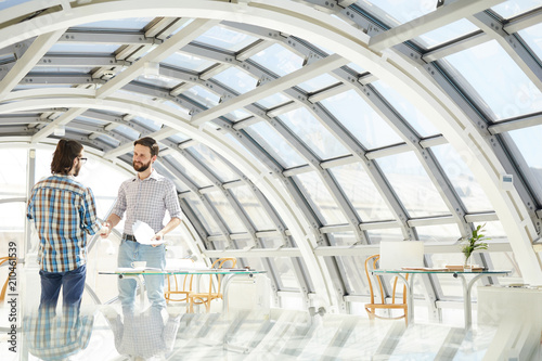 Two young businessmen handshaking after discussion of new terms of work