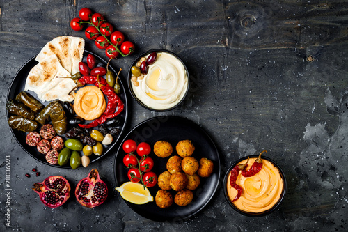 Arabic traditional cuisine. Middle Eastern meze platter with pita, olives, hummus, stuffed dolma, labneh cheese balls in spices. Mediterranean appetizer party idea