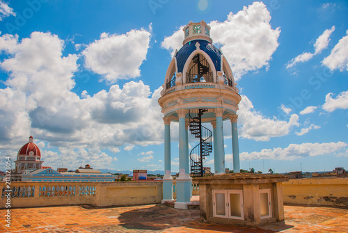 View from the terrace on the building of the Municipality. Observation rotunda with stairs on the roof of the Palace. Cienfuegos, Cuba. Palacio Ferrer, House Of The Culture Benjamin Duarte