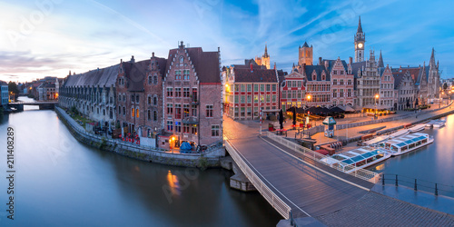 Panoramic aerial view of picturesque medieval buildings on the quay Graslei and Leie river at Ghent town in the morning, Belgium