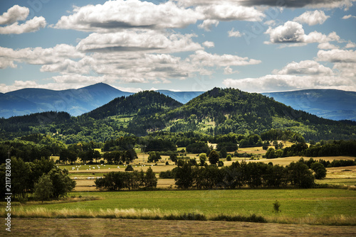 Mountain landscape, Karkonosze Mountains with clouds in the background.