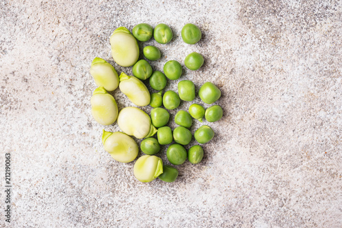 Fresh green peas and beans on light background