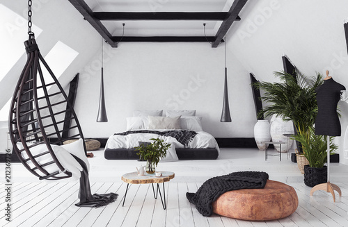 Modern open-plan apartment in attic, loft style, 3d render