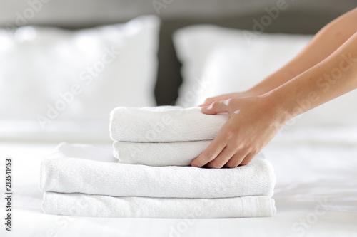 Close-up of hands putting stack of fresh white bath towels on the bed sheet. Room service maid cleaning hotel room.