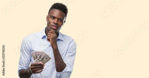 Young african american businessman holding dollars serious face thinking about question, very confused idea