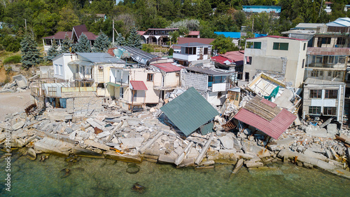 The destroyed house after the earthquake on the seashore