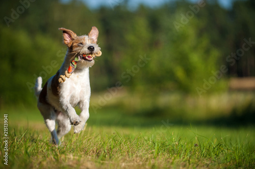 Rennender Kromfohrländer mit Spielzeug im Maul