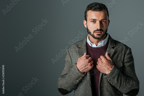 handsome stylish man posing in trendy tweed jacket, isolated on grey