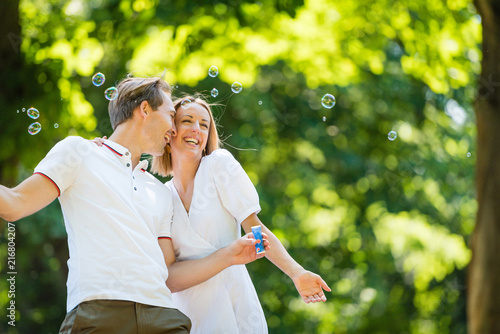 Paar beim Spiel zusammen in der Natur, hat viel Spaß mit Seifenblasen