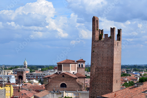 Aerial panoramic view of the city center of the little town of Rovigo with its main landmarks the tower and the Duomo. It is a nice village close to Venice in Italy.