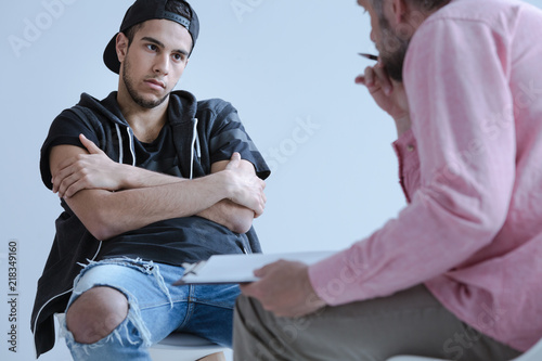 A withdrawn rebel young boy with behavioral and social disorders during his individual meeting with a psychotherapist.