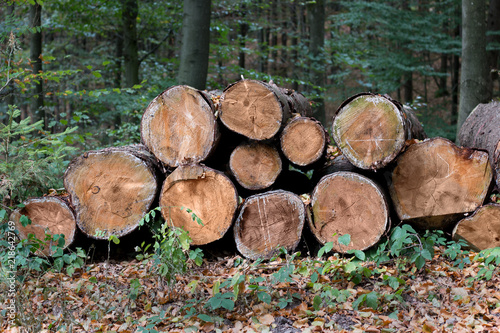 Pile of logs on meadow in forest. Trunks of trees stacked neatly in the woods.