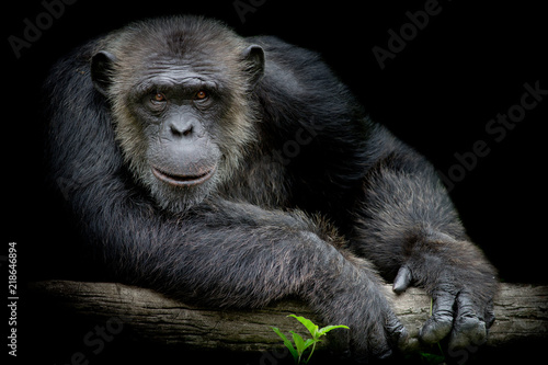 Cute Chimpanzee smile and catch big branch and look straight to front of him on black background