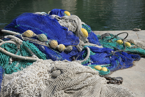 Bunte Fischernetze im Hafen, Insel Kreta, Europa