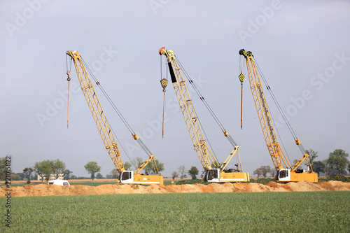 Dźwigi i koparka na budowie rurociągu, wykopy, pola.