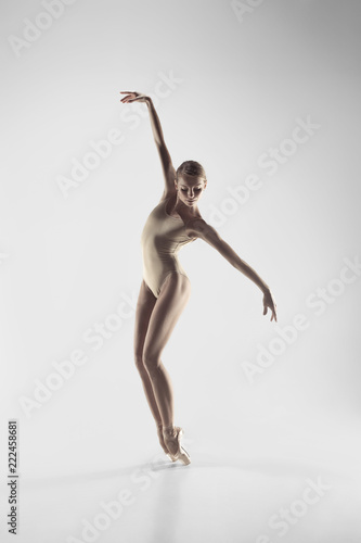 Young graceful female ballet dancer or classic ballerina dancing on white studio. Caucasian model on pointe shoes