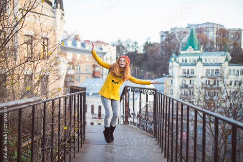 Red hair beautiful woman wearing yellow coat walking outdoors. Autumn time, city on background