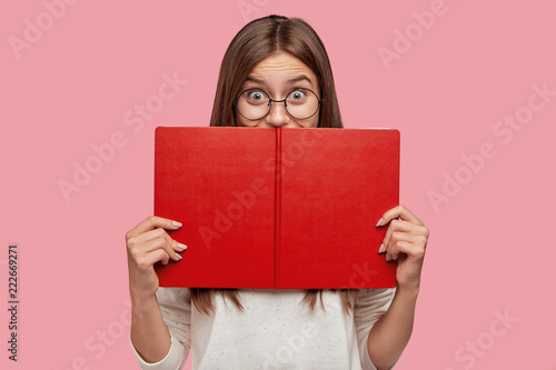 Happy book reader hides behind textbook, has joyful expression, finds out something new, has interesting hobby, wears round big spectacles for good vision. Female geek studies informative topic