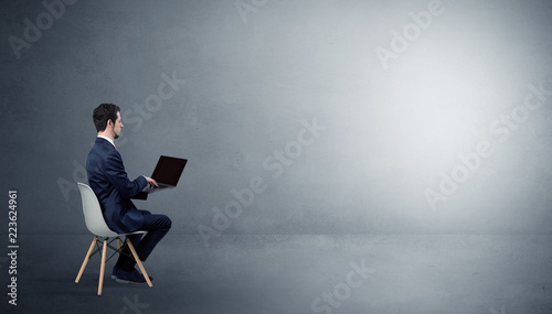 Businessman staying in an empty grey dark room with stuffs on his lap