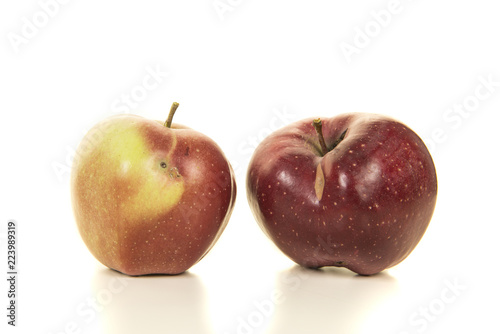 Two biological, organic, red apples with some small faults on a white background