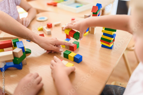 Preschool teacher with children playing with colorful wooden didactic toys at kindergarten