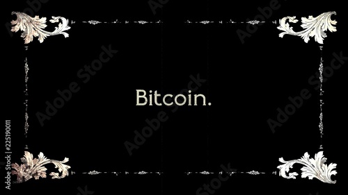 A re-created film frame from the silent movies era, showing an intertitle text messages: Bitcoin.