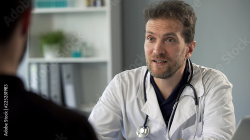 Charlatan speaking with patient about fake diagnosis and prescribing supplements