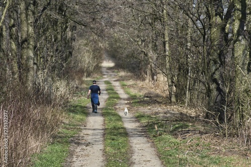 Wiosenne spacery na słońcu, mężczyzna spaceruje z psem po polnej drodze, na końcu drogi inna oświetlona droga