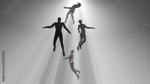 People floating, rising into light beams , heavens, space. Astral plane.Silhouette, shadow figure. 3d rendering