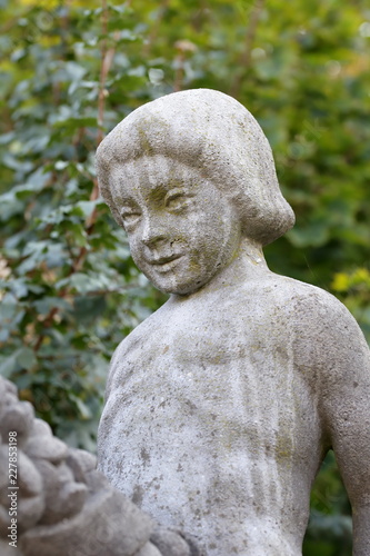 Stone figure, weathered, child on horse, detail, bridge town Hamm in Germany