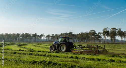 Een boer is met zijn trekker het gemaaide gras aan schudden