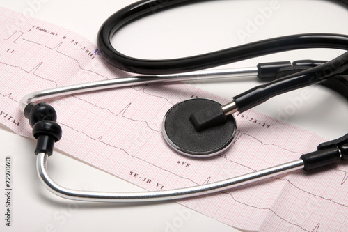 Wydruk EKG z przychodni zdrowia i stetoskop