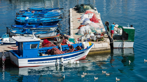 Fischer reparieren ihre Netze im Hafen von Gallipoli