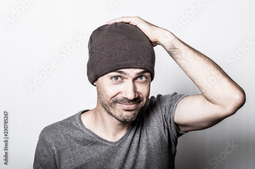 homme casual portrait bonnet gêner timide barbe quarantaine 40 ans gris serein heureux calme regard confiant avenir confiance jeune vieux libre liberté valeur moral