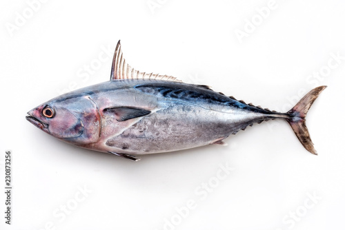 Fresh saltwater bonito as top view on white background with copy space – isolated