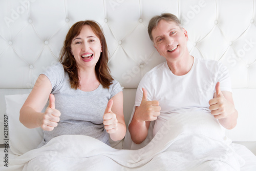 Smile with perfect white teeth. Middle age couple in bedroom lying in bed in blank t shirt and showing big thumbs up. Happy family life and relationship. copy space
