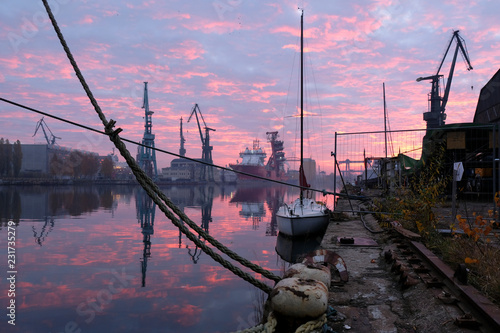 Polska, Gdańsk - tereny stoczniowe o wschodzie słońca, Szlak Stoczni Cesarskiej
