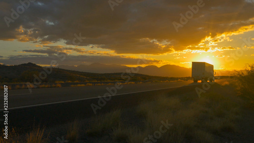 Freight semi truck speeding on empty highway over golden sun at summer sunset