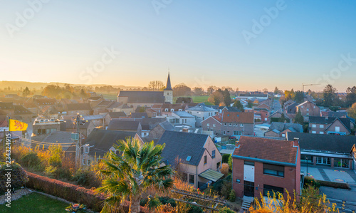 Ancient church in a village on a hill below a blue sky at sunrise at fall