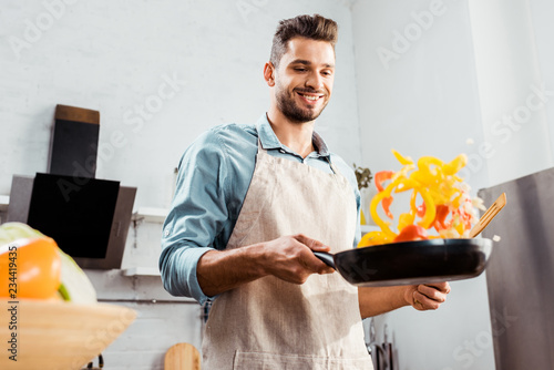 low angle view of smiling young man in apron holding frying pan with vegetables