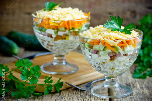 Festive layered salad serving in glass from smoked chicken fillet, egg, cucumber, carrot, potato and cheese